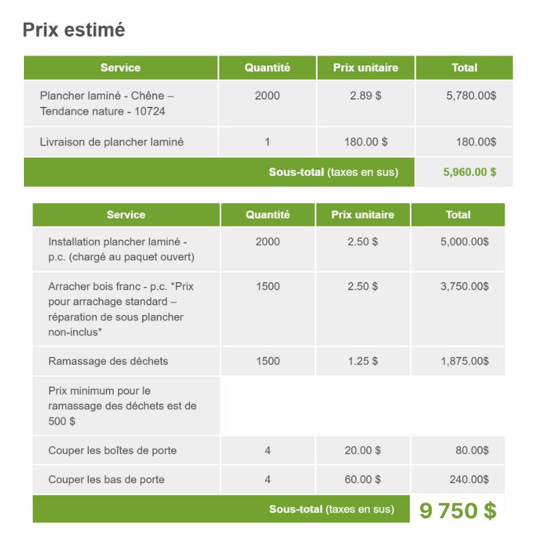 Une soumission complétée en ligne auprès d’une entreprise spécialisée nous permet d’affirmer qu’un projet de plancher flottant de 2 000 pieds pourrait revenir au prix de 5 960,00 $ pour l’achat et la livraison des matériaux.